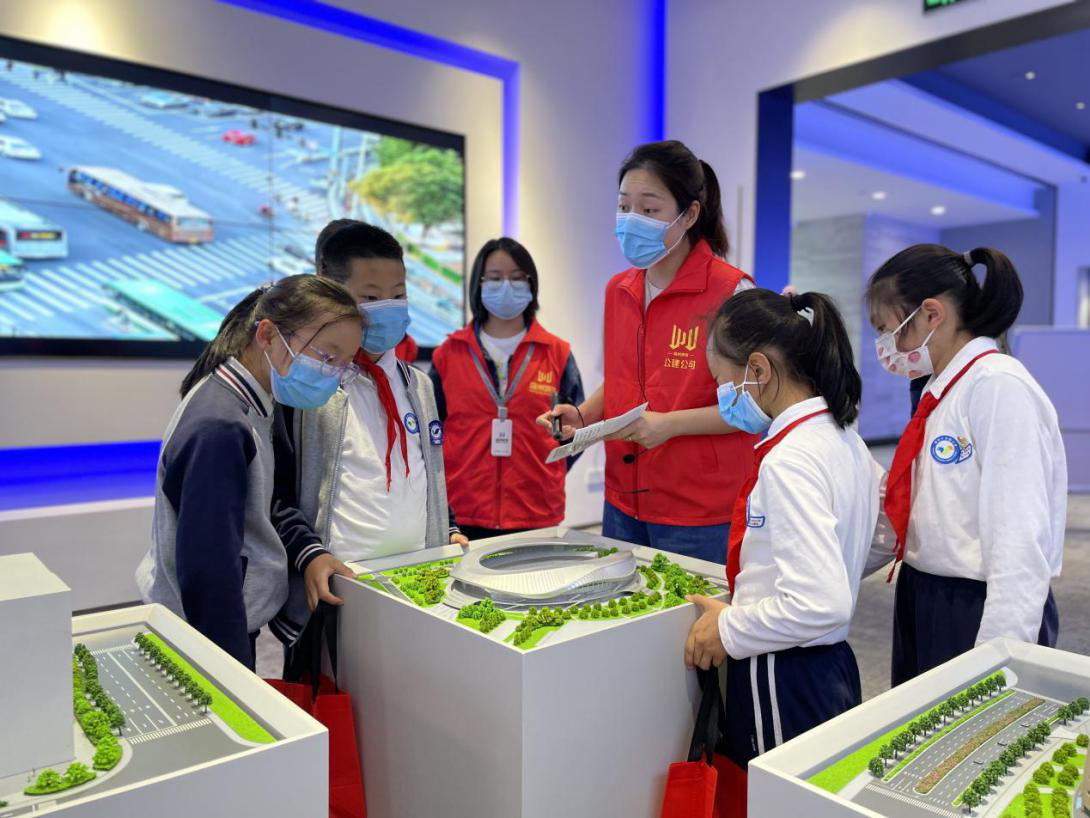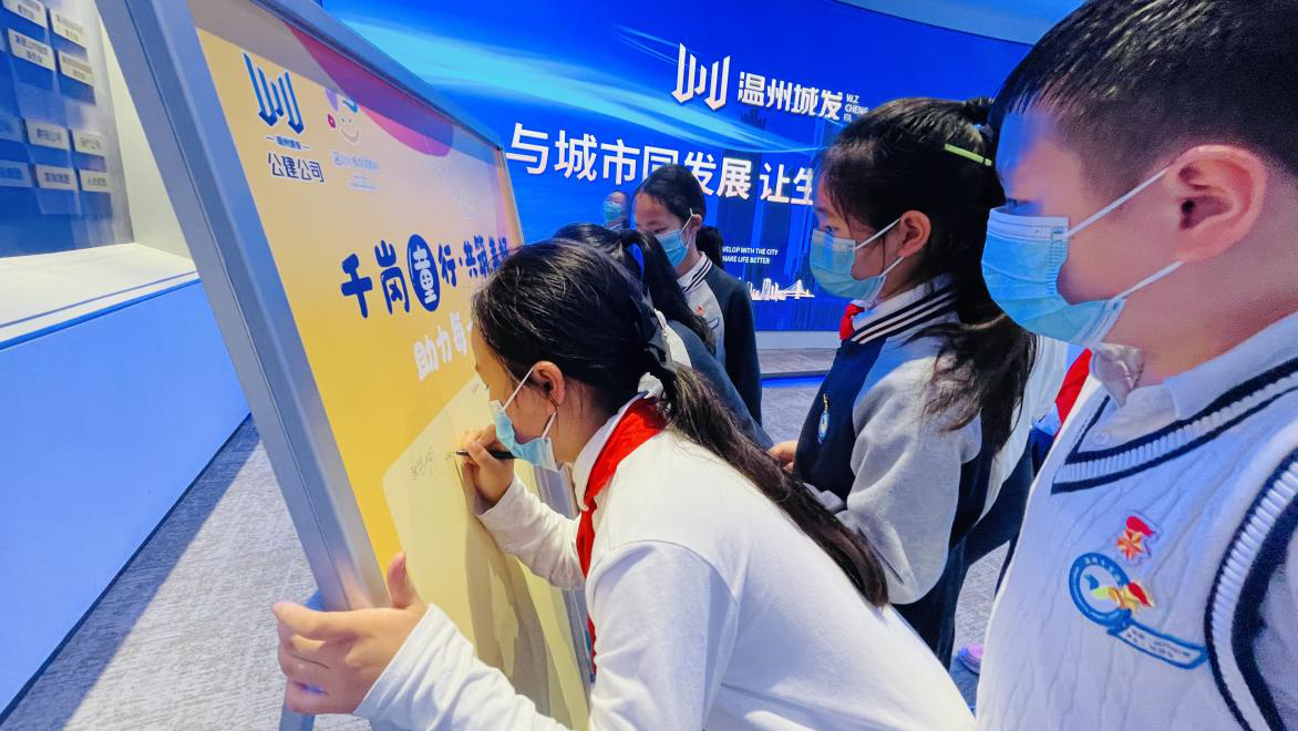 巾帼岗成员们为他们详细介绍城市地标建筑,如城市阳台,温州奥体中心、美术馆等,并一一解答疑惑。随后,学生们通过参观集团数字化展厅、观看企业宣传片,进一步了解城市建设、运营和未来发展的相关知识,体会“与城市同发展,让生活更美好”的城发使命,激发他们作为小小市民参与城市建设、助力城市发展的责任感和使命感。接着,孩子们带着对城市未来的期盼,发挥想象,在主题展板上写下对城市建设和发展的感想和愿望,用童心点亮城市未来。