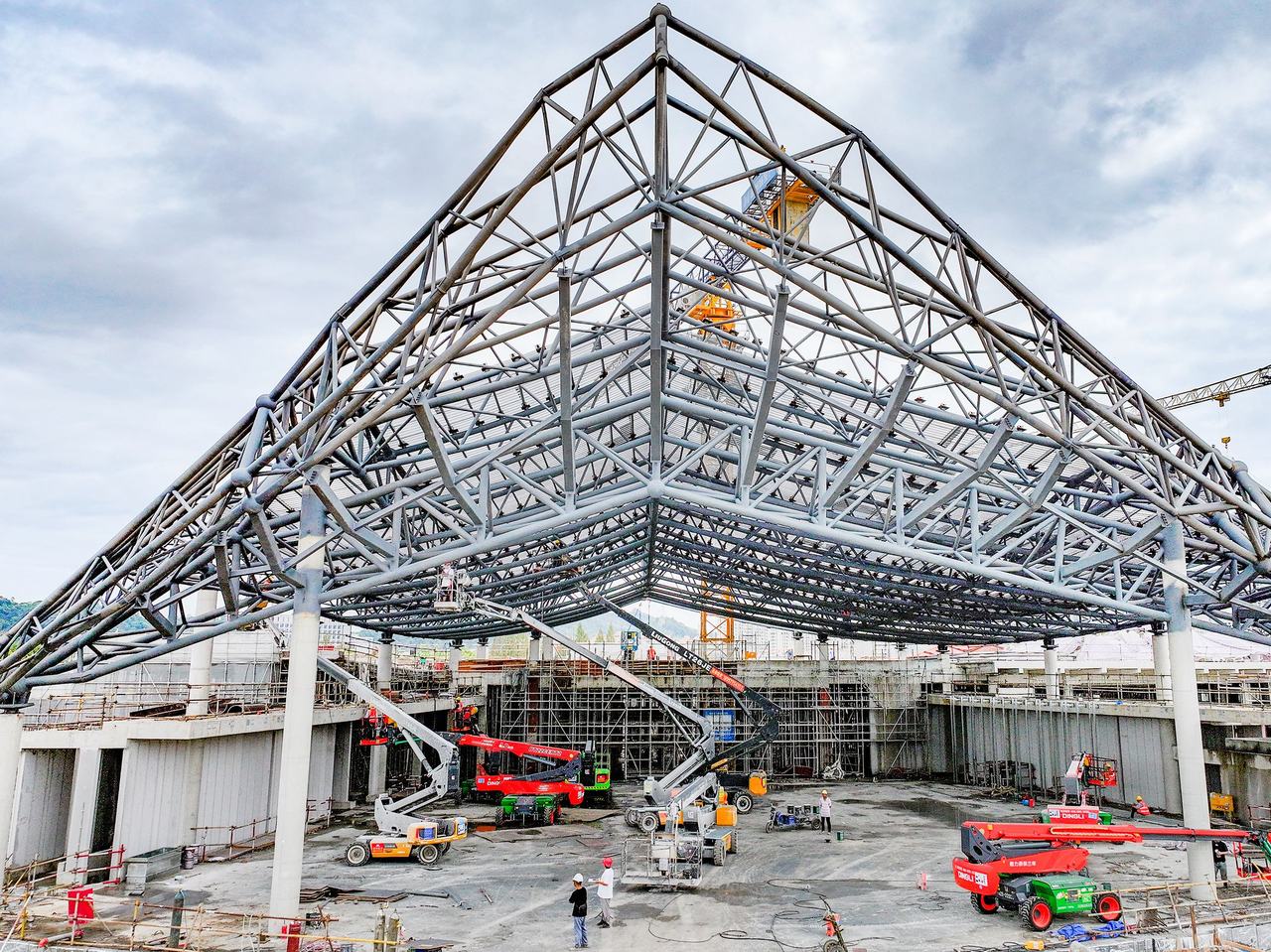 走进山水中国馆,记者被如山似浪的建筑造型吸引,只见工人们在屋顶沿着曲线弧度铺设金属屋面龙骨和构造层,耐心仔细。中建二局园博园一标段项目生产经理季尧先告诉记者,根据建筑造型和节能环保的功能需求,该馆屋面采用异形双曲弧形钢桁架结构,设计有吸声、防水、保温等11层材料。展馆外墙设计为玻璃幕墙,最高19米,单块玻璃最高达7.5米,对材料性能、安装工艺要求极高,“为高效作业,我们加强室内外、地下地上全方位穿插施工,同步开展室内机电安装、精装修等工序,预计10月底显露全貌。”