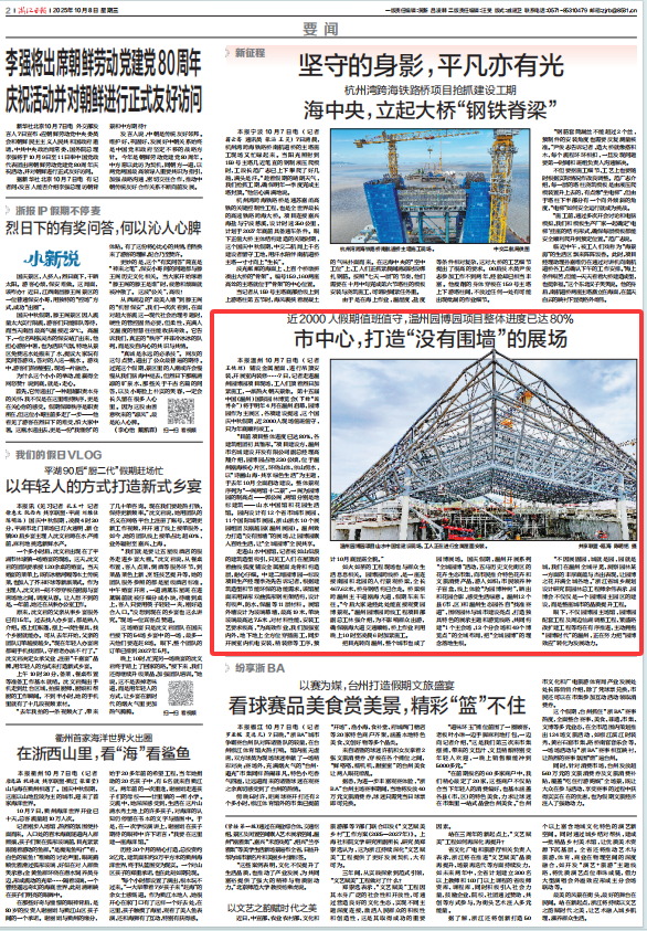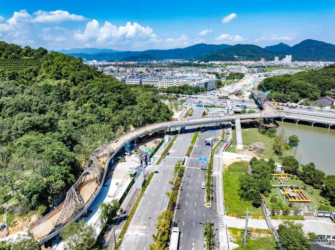 如火如荼的工程现场也与群众生活息息相关。园博园跨线桥,是一座连接南园和北园的人行景观桥梁,全长467.62米,桥身钢结构已合龙。桥梁横跨温州主干道瓯海大道,假期车来车往。“今后大家途经此处能直接观赏园博景观。”温州园博园跨线工程项目部副总工林强介绍,为不影响群众出游,确保瓯海大道交通顺畅,桥上作业利用晚上10时至凌晨6时加紧施工。