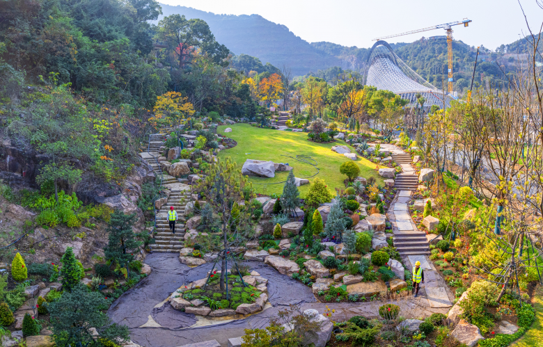 岩石园位于园博园南入口左侧,建设面临的最大挑战是20余米的天然落差。项目设计团队经过反复论证,最终确定了“依山就势、分层造景”的设计方案,将陡峭坡地转化为四季特色鲜明的景观序列。