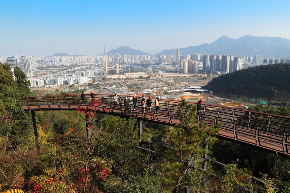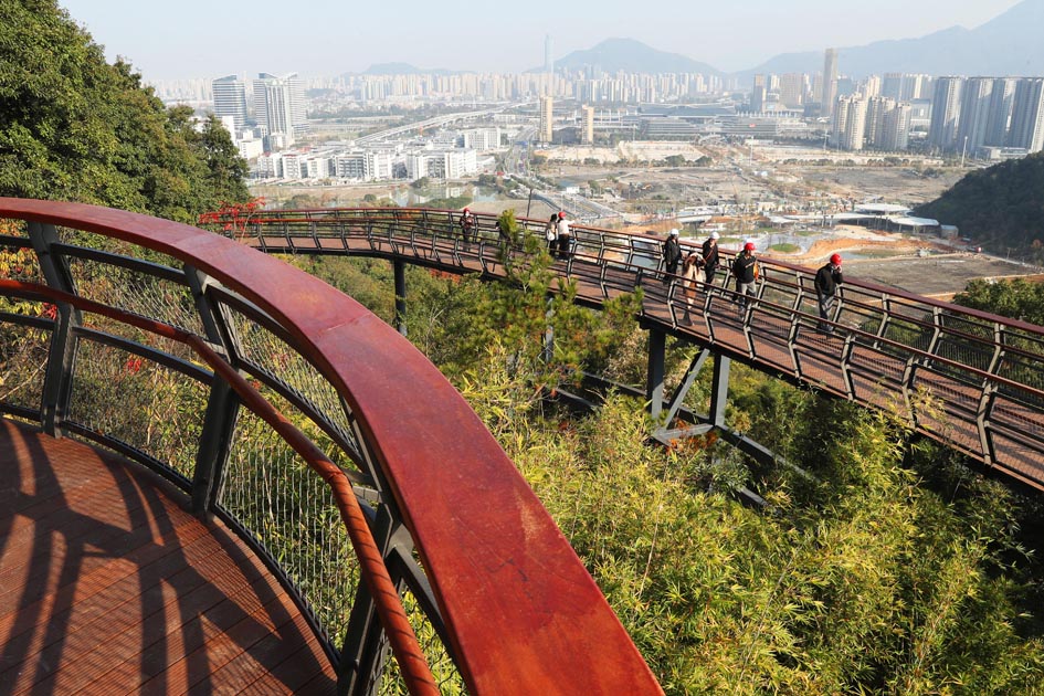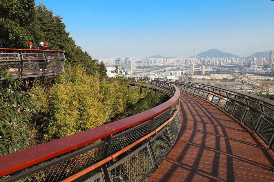 仙道共分三个部分,包括两段总长度约390米的新建无障碍架空栈道,一段130米长的原有登山道更新段,再加一个300多平方米的山顶观景休憩平台。仙道的空中视角串联起园博园南园的全部园景,色彩斑斓的集装箱市集、等待播种的大片农田、形如一瓣瓣瓯柑切面的柑橘园、造型设计独具一格的温室花园……南园初具雏形的美,各美其美,美美与共,汇聚在仙道“一览无余”。