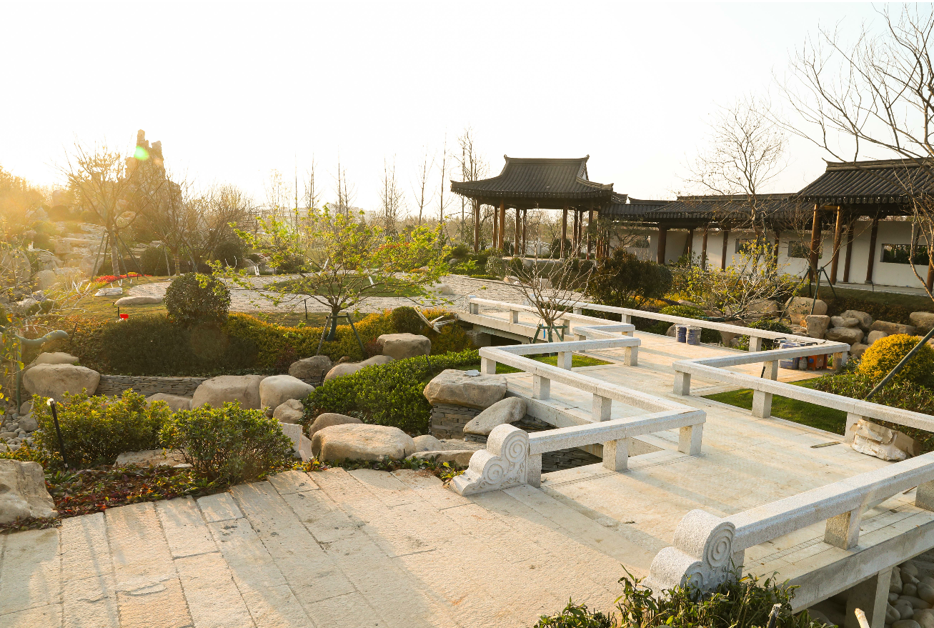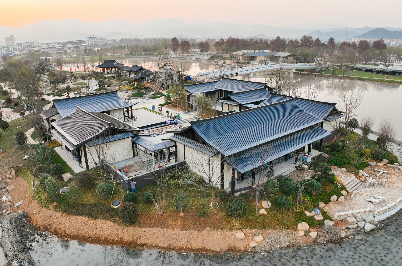 瓯越园的设计灵感来源于元代王振鹏的《江山胜览图》,设计师从中提取山、水、林等元素,通过传统的造园手法,“再现”温州古城的山水田园与市井生活。