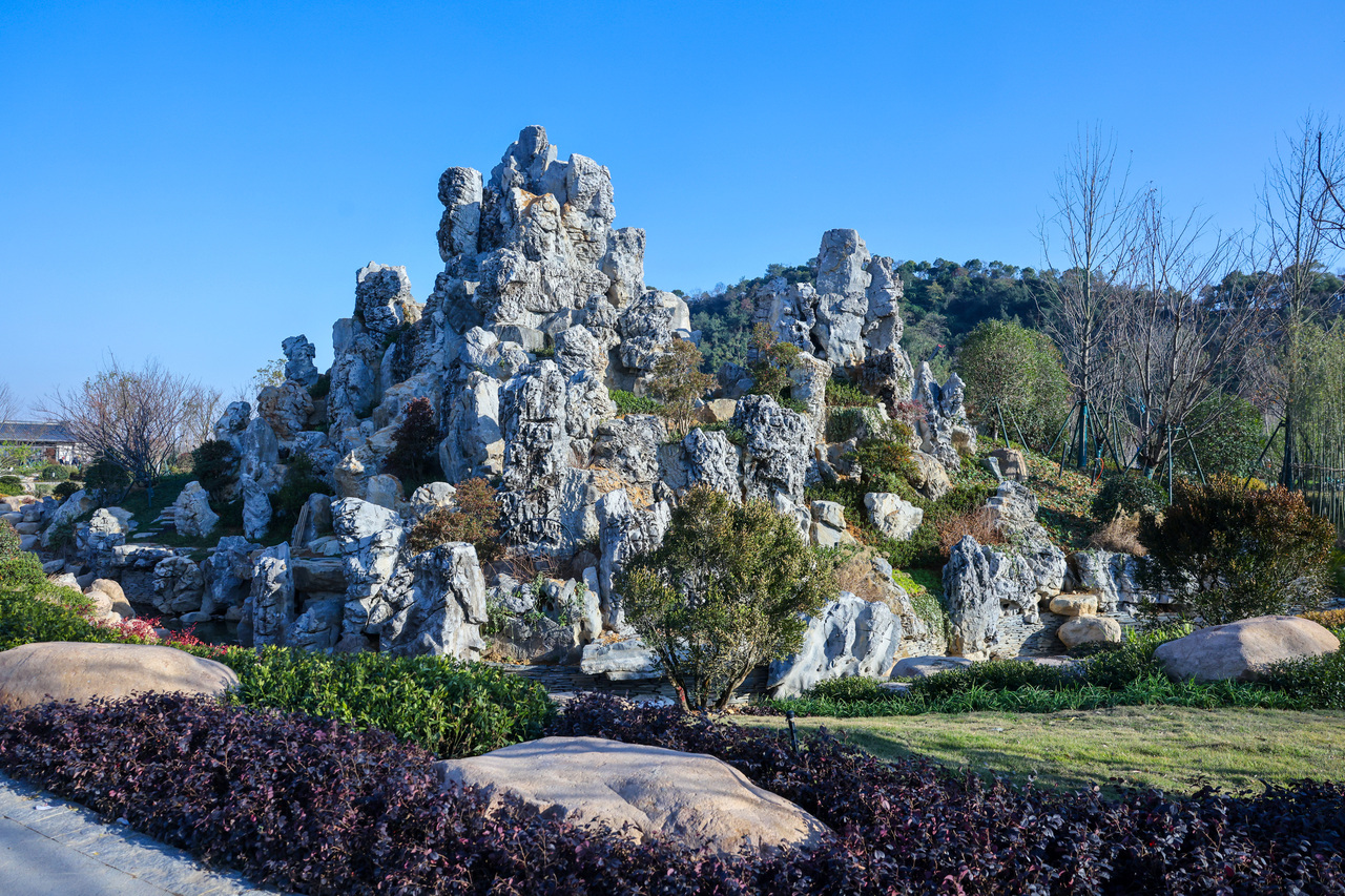 石头堆叠更是一场“艺术实验”。园区院墙、驳岸、小桥均采用天然毛石砌筑,特邀杭州园林大师现场指导,逐块调整石头的朝向、纹理与嵌合角度。“仅一个三米见方的驳岸样板段,就推倒重做了三次。”高翔坦言,工人们如同拼接古画般将石头“嵌”入地势,确保缝隙自然、肌理连贯,远观如山体裂隙,近看似溪流冲刷千年而成。