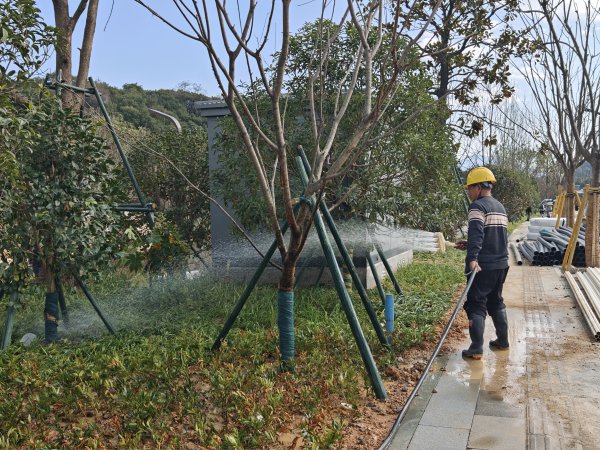 繁盛路上,印有园博标志的浅黄色道旗迎风招展,氛围感拉满;草坪前,养护人员手持水枪,对各类花卉植被精准浇灌,滋养绿意生机;环卫工人弯腰清扫角落里细小的建筑垃圾,全力擦亮园区“颜值”……园内园外,各项扫尾工作紧锣密鼓、有条不紊,每一处细节都彰显着筹备的用心。