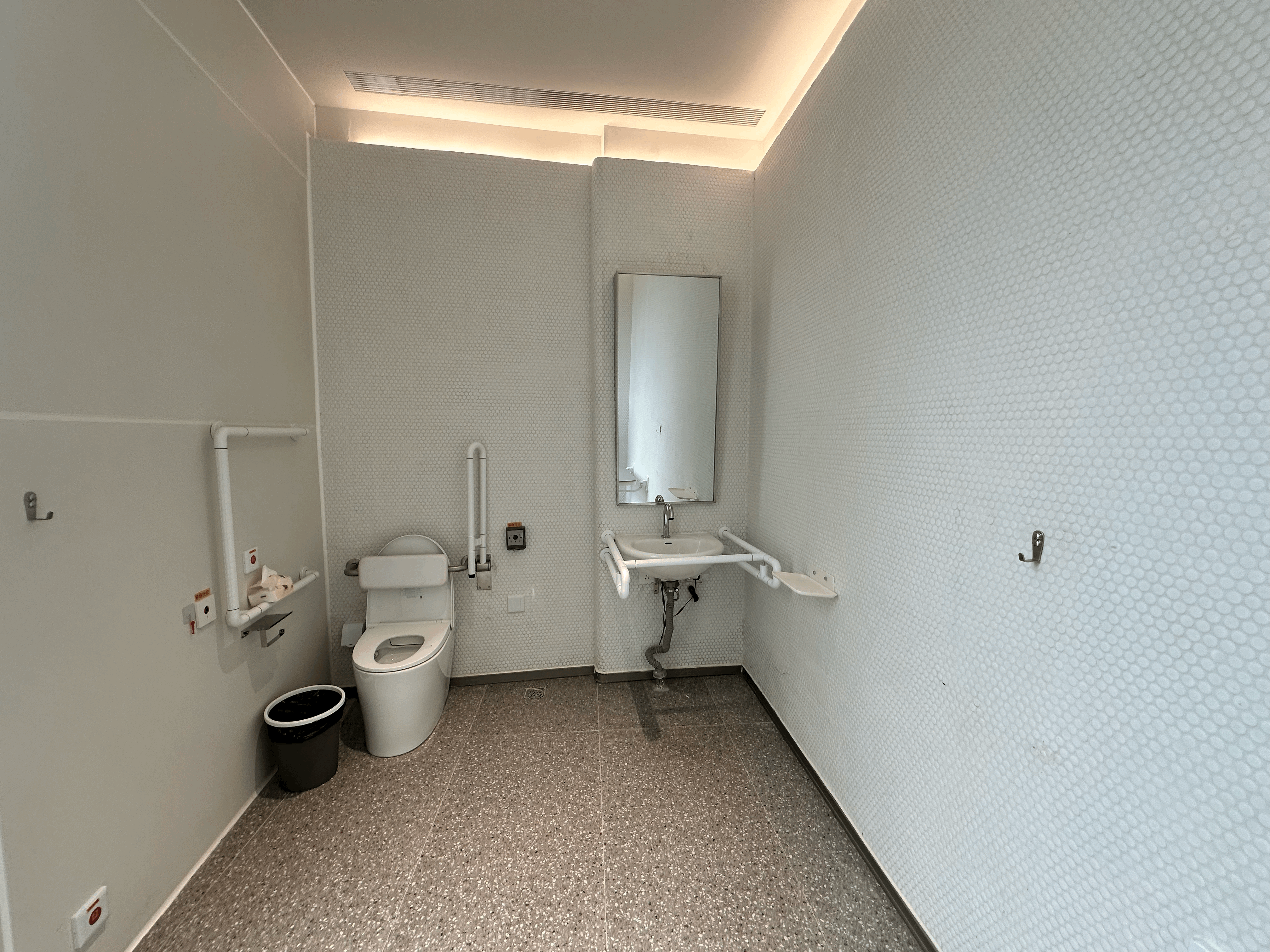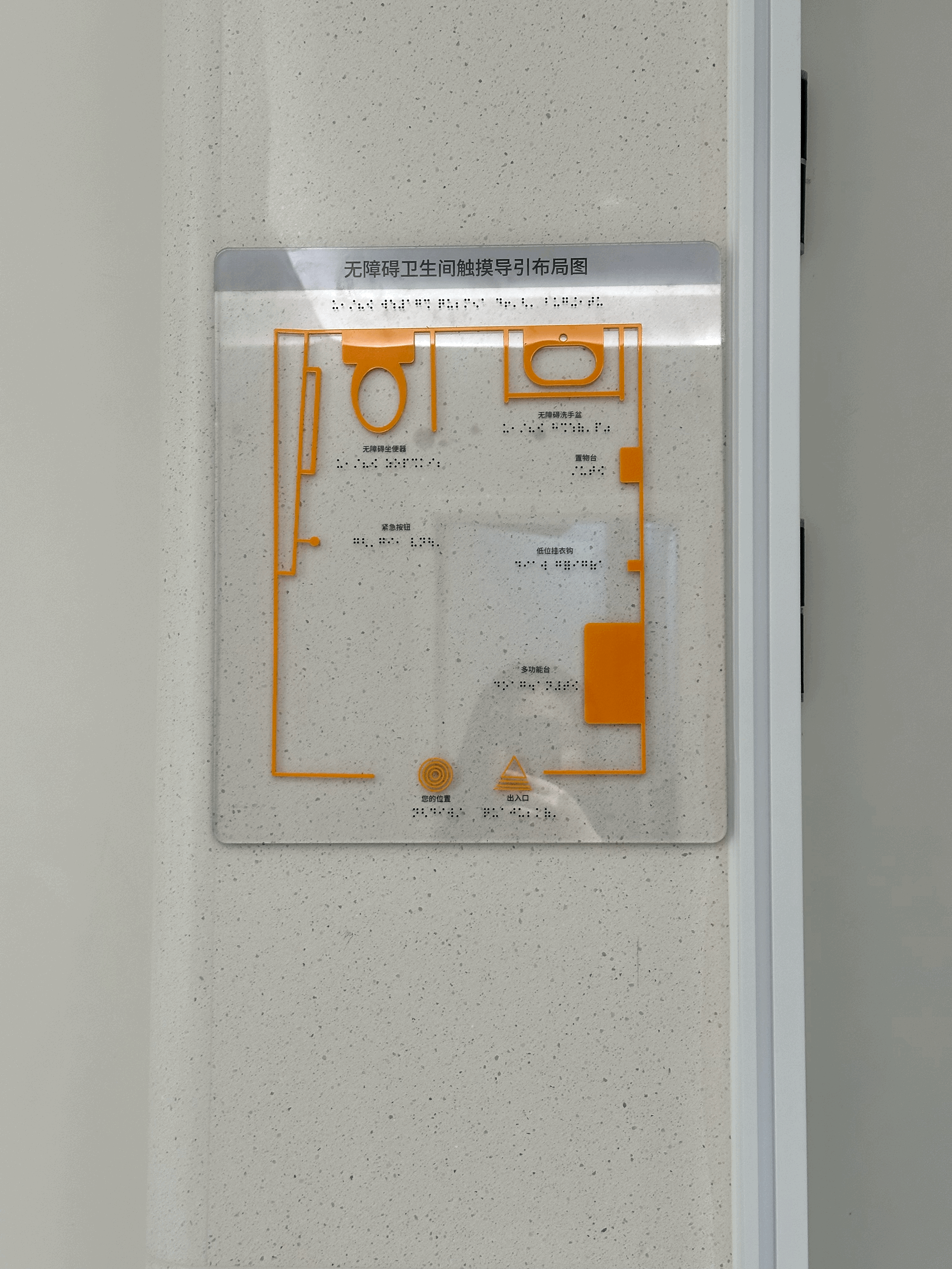 中国馆目前正准备申报无障碍环境三星级认证。馆内的无障碍设计做到了“极致细化”:无障碍电梯内,设置了低位按钮、三面扶手和镜面,楼层显示与报层音响同步,既方便轮椅使用者操作,也能让视障人士清晰知晓电梯运行状态;低位服务台,方便轮椅使用者及儿童轻松靠近。台面下方预留容膝空间,轮椅使用者可轻松靠近咨询;休息厅内划分专属轮椅席位。无障碍卫生间细节更是拉满。智能马桶配备靠背,扶手可上下翻动、高度贴合人体工学,同时设置高低位呼叫器,满足坐在坐便器上和跌倒在地面的人均能够使用。洗手盆采用无障碍设计,下方预留足够空间方便轮椅伸入。“很多地方的无障碍卫生间只是‘达标’,但我们是严格按照最高标准落实,就连卫生间门口都设置了盲文布局标识。”徐来青说。