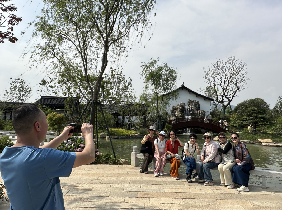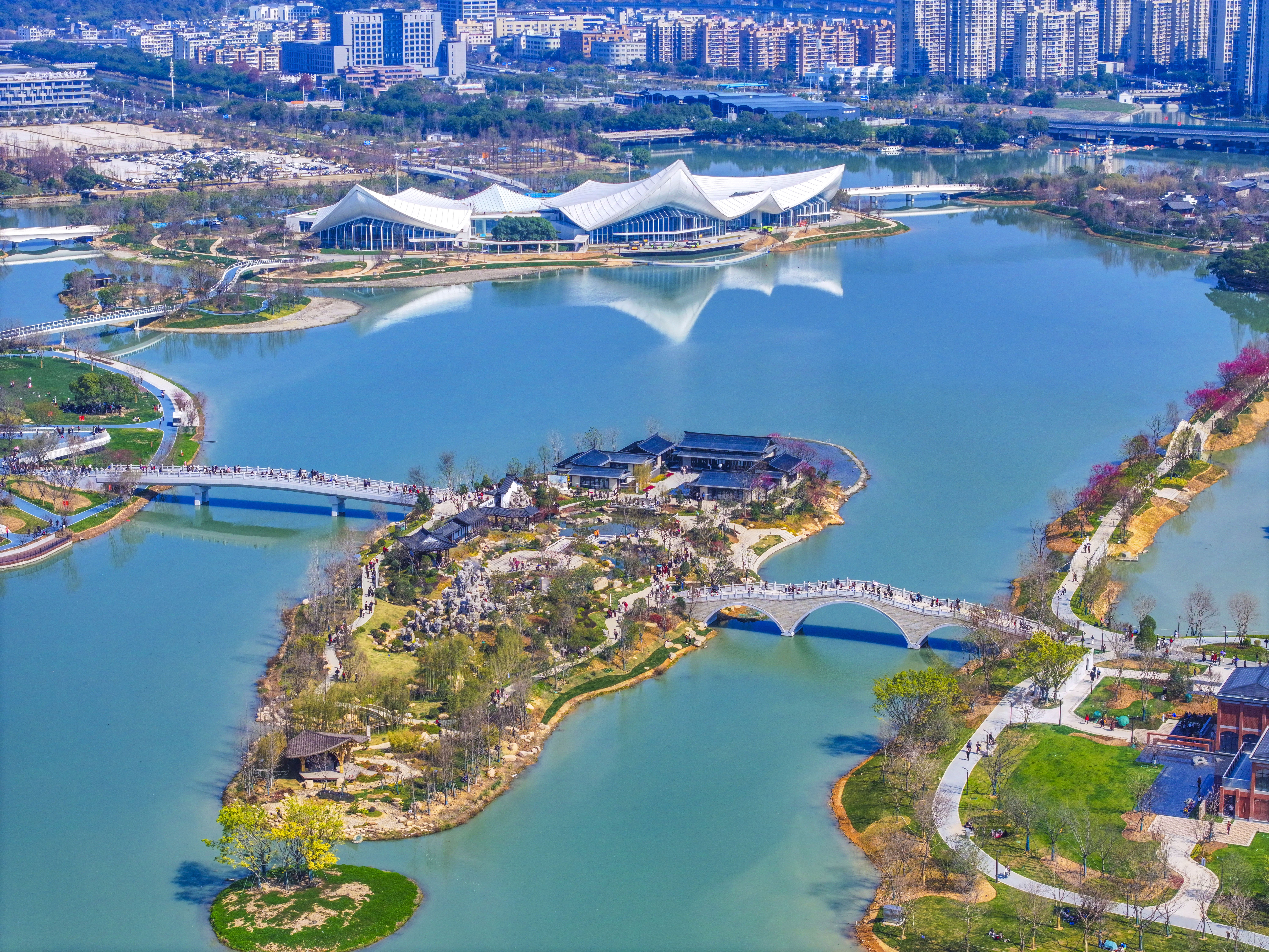 沿着瓯海大道一路驶向繁盛路,从温州园博园北园主入口进园,不到5分钟脚程,就能踏上同舟桥。桥的名字取自孟浩然诗句“借问同舟客,何时到永嘉”,呼应温州古称永嘉。桥那头,便是瓯越园。