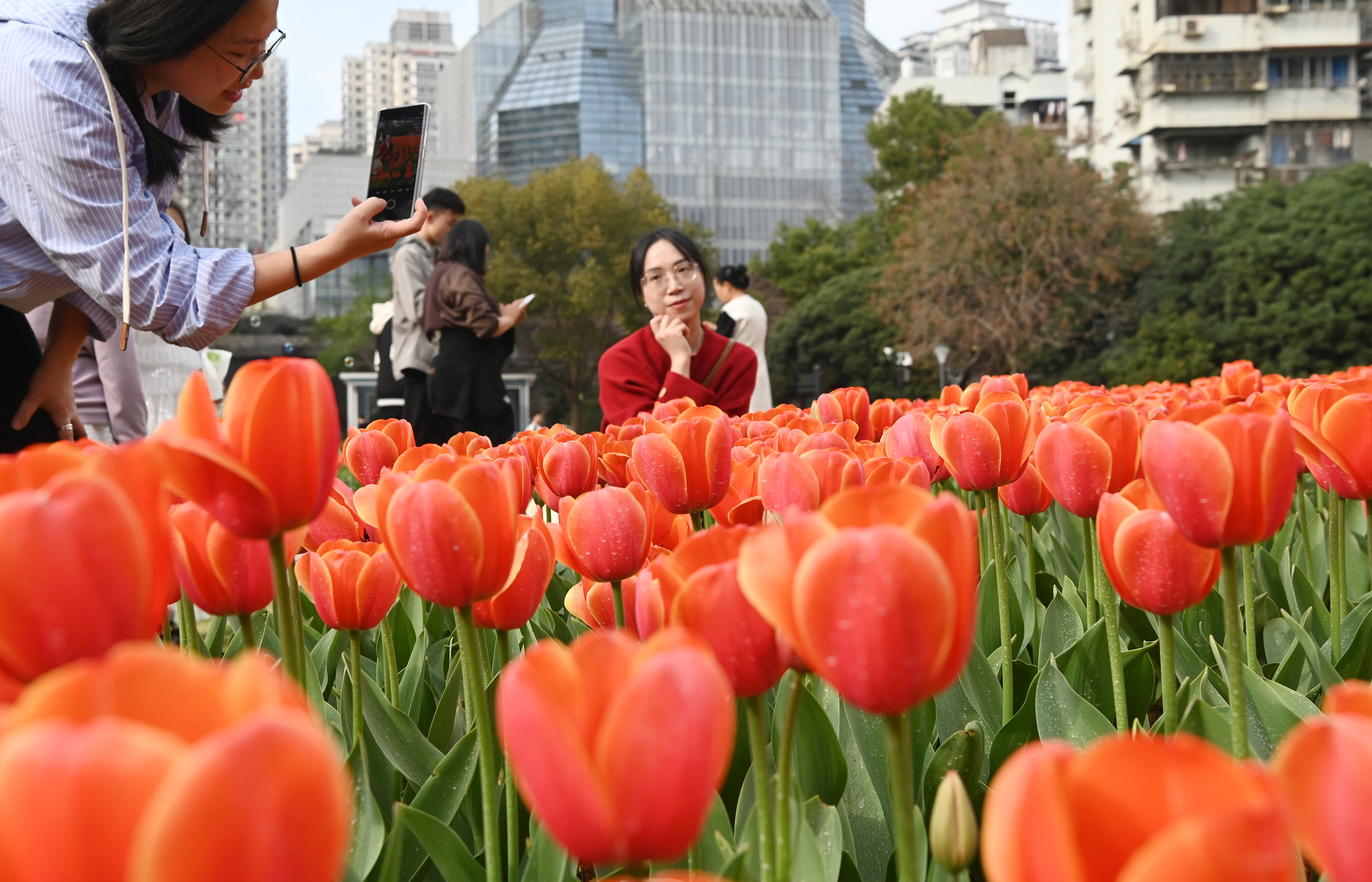 2月19日,马鞍池公园内,红、黄、粉、白、橙等各色郁金香相继开放,一片片花海像打翻的调色盘,在阳光下分外绚烂、治愈,众多市民、摄影爱好者前来赏花拍照、打卡。